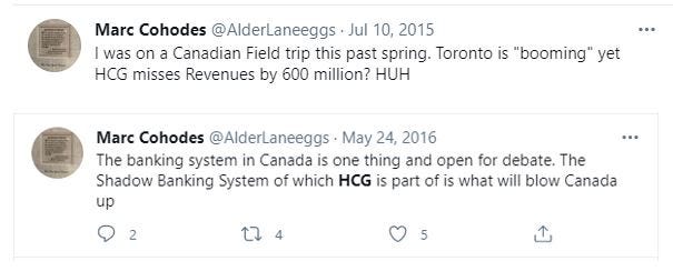 Cohodes tweeted several times on the back of the OSC notice. “I share my thoughts with more than just Twitter on HCG…I have a feeling the Queen Street Cowboys [Cohodes’ nickname for the OSC] are just starting their ride. GLTFA”. Indeed. Cohodes’ efforts to take down a company appear to extend beyond confidence erosion. Amidst the feeling that there is something wrong, Cohodes still requires a catalyst.
