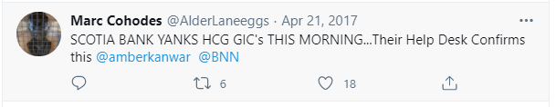 And then things fell apart. On April 21st, rumours flew that Scotiabank had restricted client access to Home Capital GICs, the doing of a “mid-level” employee according to one source. Scotia’s move was a major indictment of Home, taken by a large and highly respected Canadian financial institution. While the financial consequences of this action were negligible in the short-term, the optics were atrocious. “SCOTIA BANK YANKS HCG GIC’S THIS MORNING…” Cohodes tweeted that day. It did not matter that the move was reversed by Scotia over the weekend as news traveled up the chain of command at the bank. The damage was done.