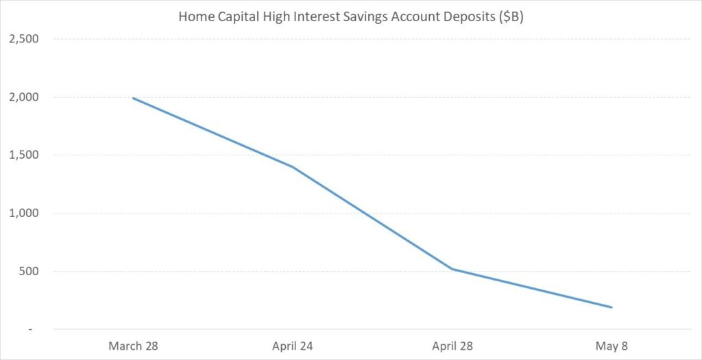 Remember Home Capital’s near-impenetrable armour? That 83% of deposits were locked-in, but the remaining 17% in high interest savings accounts could be withdrawn in a matter of days. Home lost two-thirds or $880 million of its high interest deposits the week of April 24th. By the beginning of May, virtually every dollar deposited with Home that wasn’t contractually locked-in was pulled, an unthinkable situation for any bank but especially shocking in light of Home’s strong financial position, robust results, and the fact that, as stated by the company on a conference call in early May, 90% of all deposits were insured by the federal government